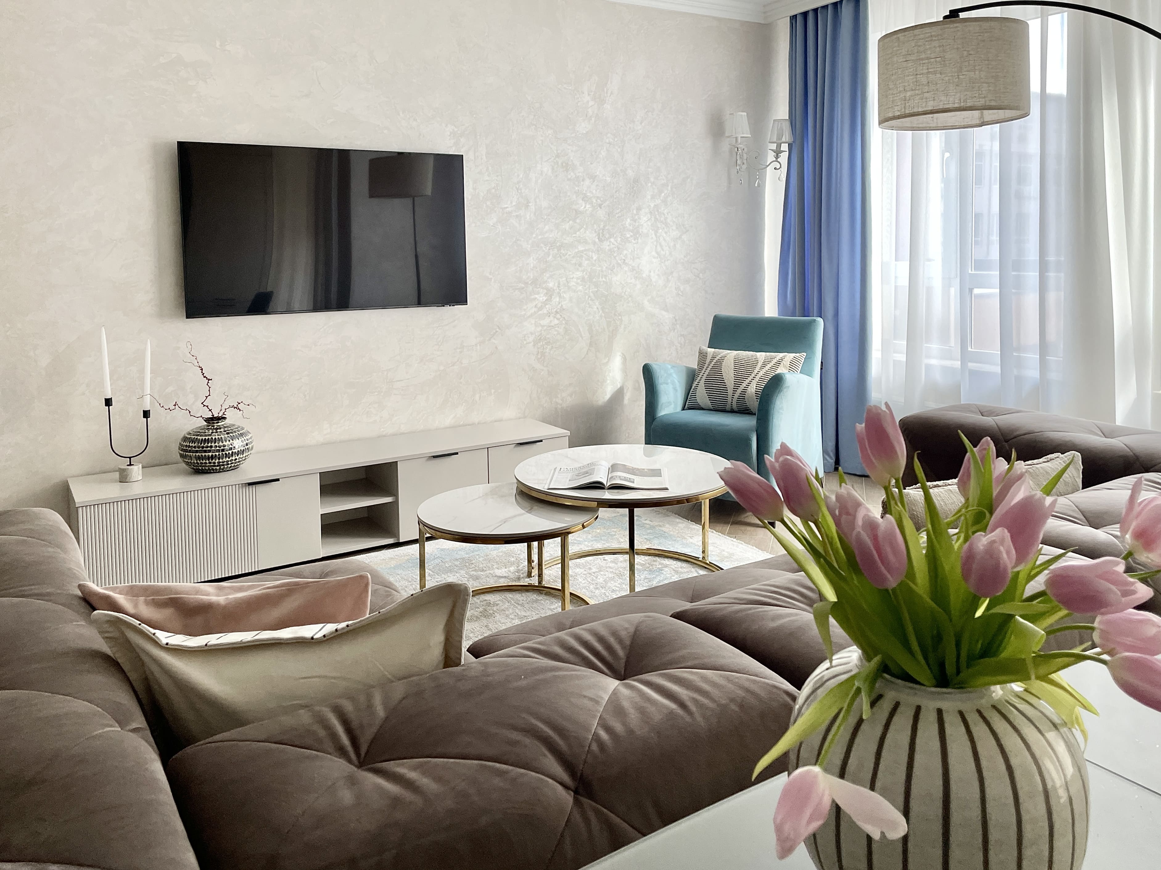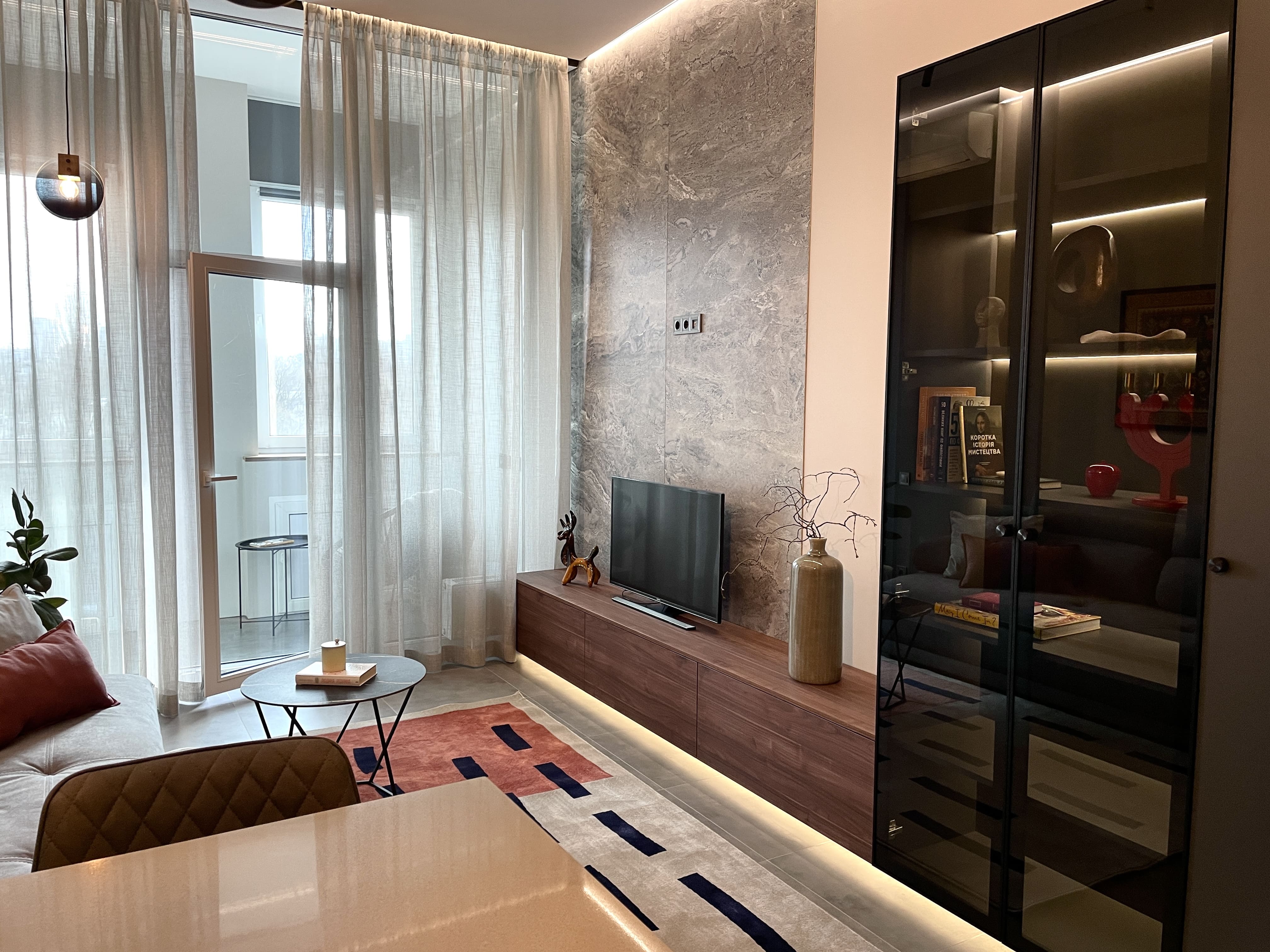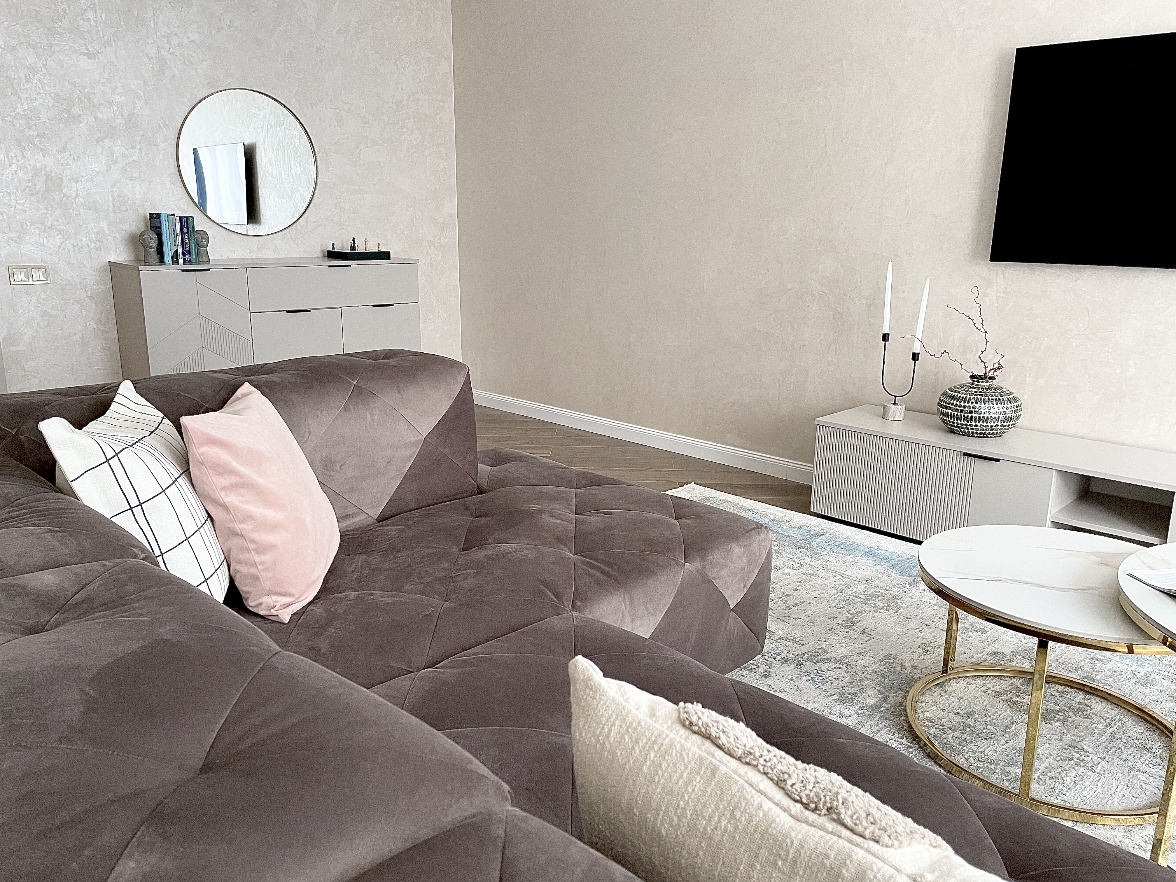 Цей об’єкт, у ЖК Варшавський, став справжнім викликом з точки зору використання кольорів в інтер’єрі. Наша головна мета полягала в тому, щоб перетворити простір на більш теплий, затишний та «живий», зробити 50 відтінків сірого привабливими, яскравими та стильними, позаяк цільова аудиторія для цієї квартири – молода пара або сім’я.