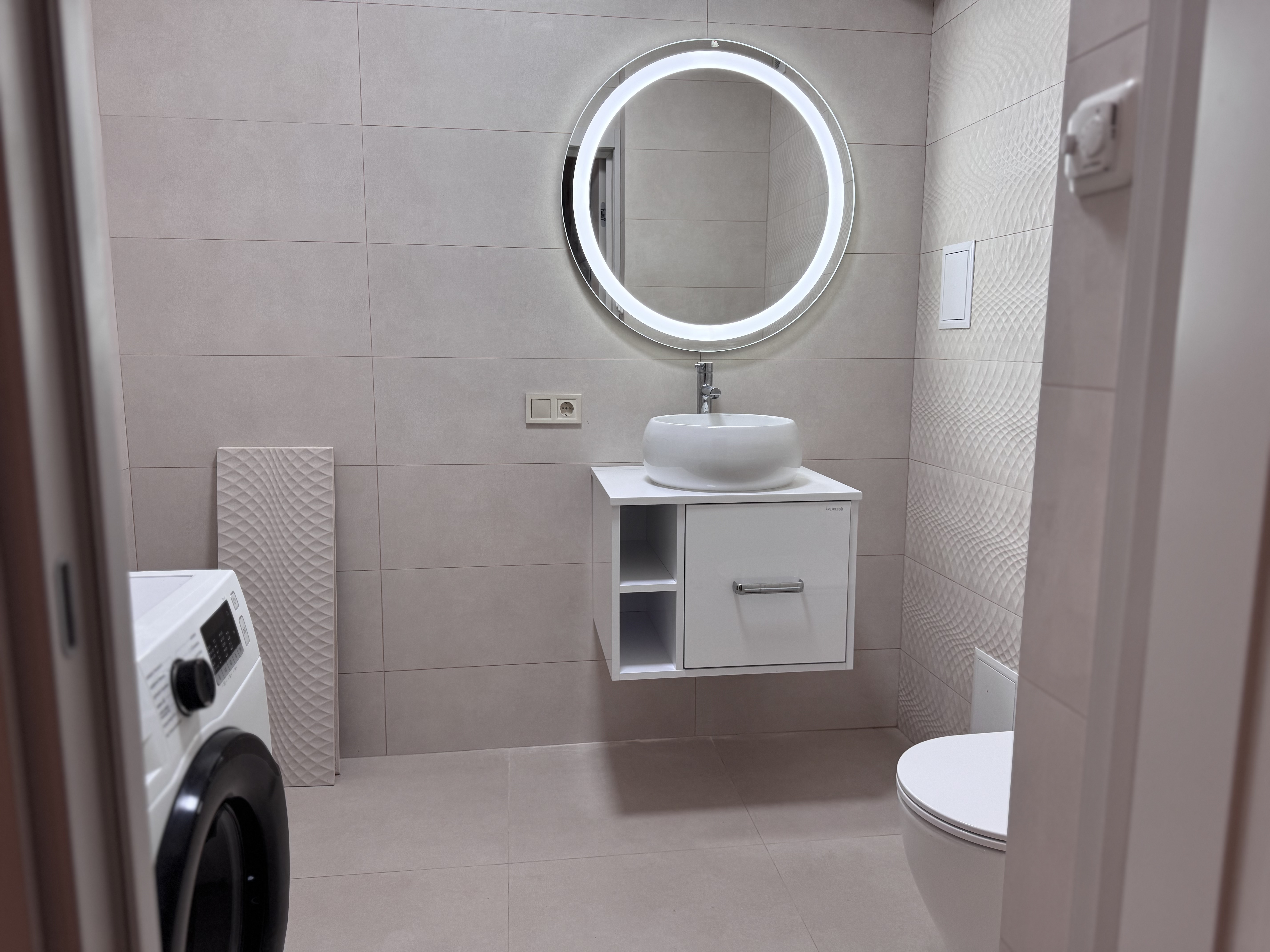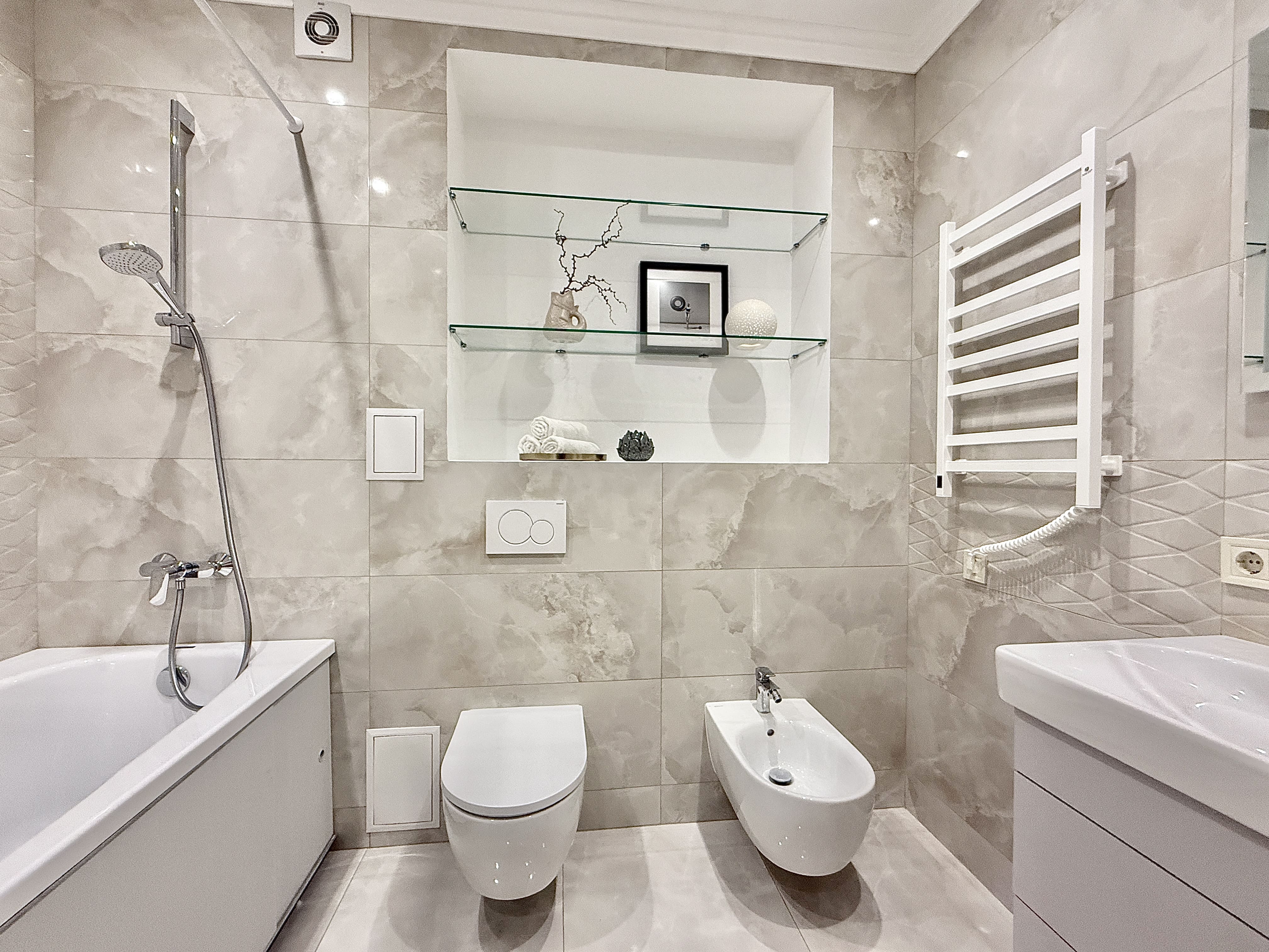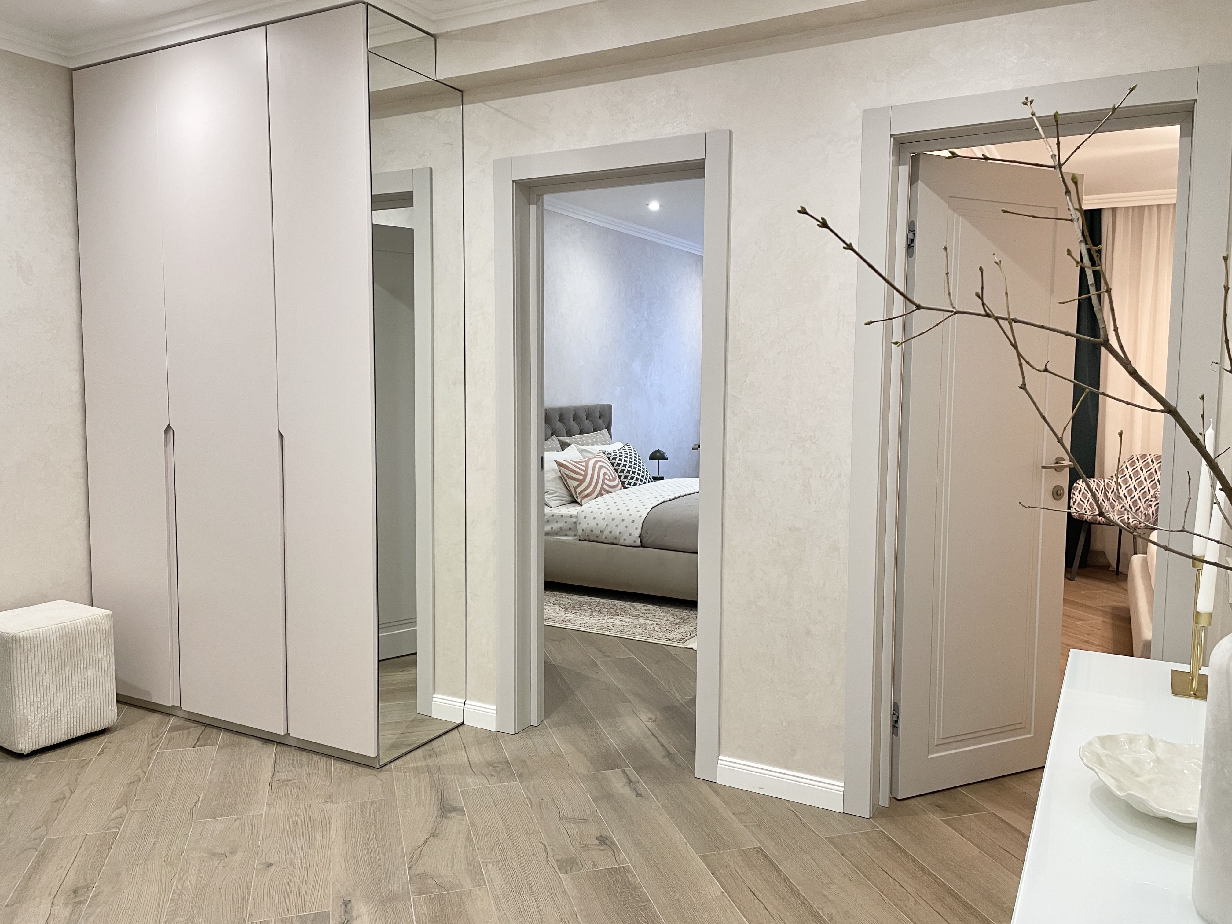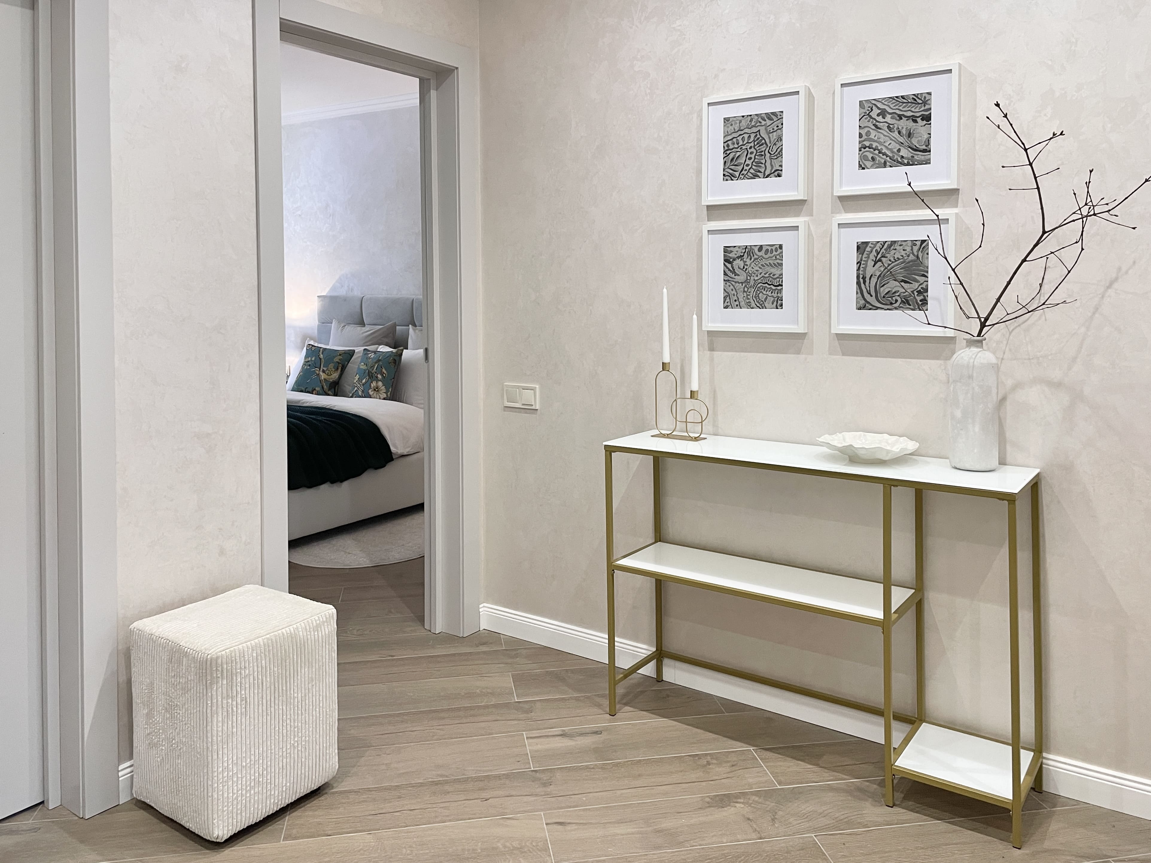 Ми оздобили текстилем ліжка в обох спальнях. В основній спальні додали зону туалетного столика, а у другій - обладнали робоче місце біля вікна. У вітальні додали комод, що слугує не лише декоративним акцентом, а й функціональним простором для зберігання речей. Основний санвузол було доукомплектовано всім необхідним, також у ніші з'явились декоративні полиці. У гостьовий санвузол ми спроектували та встановили зручну шафу для зберігання побутових речей.