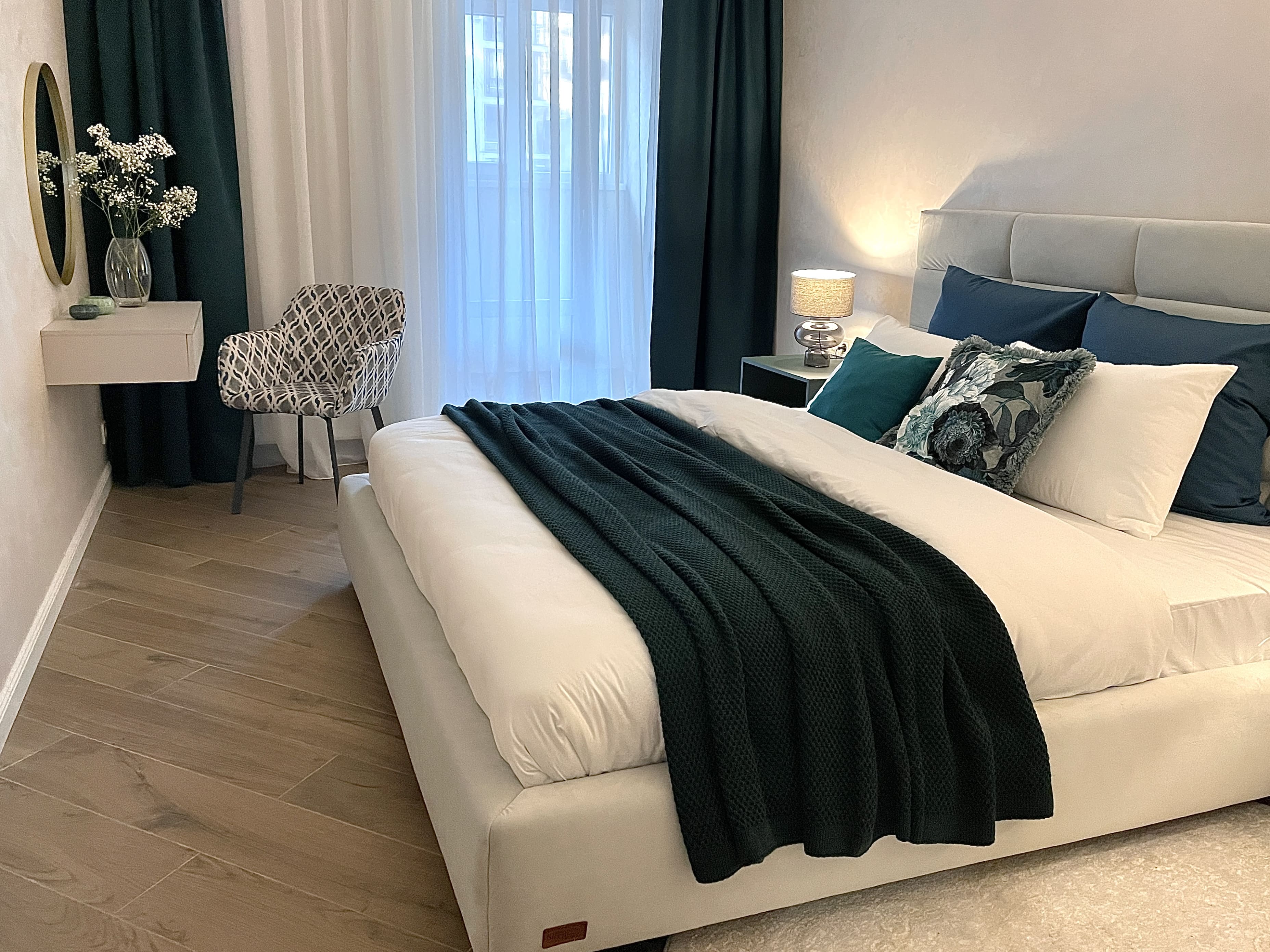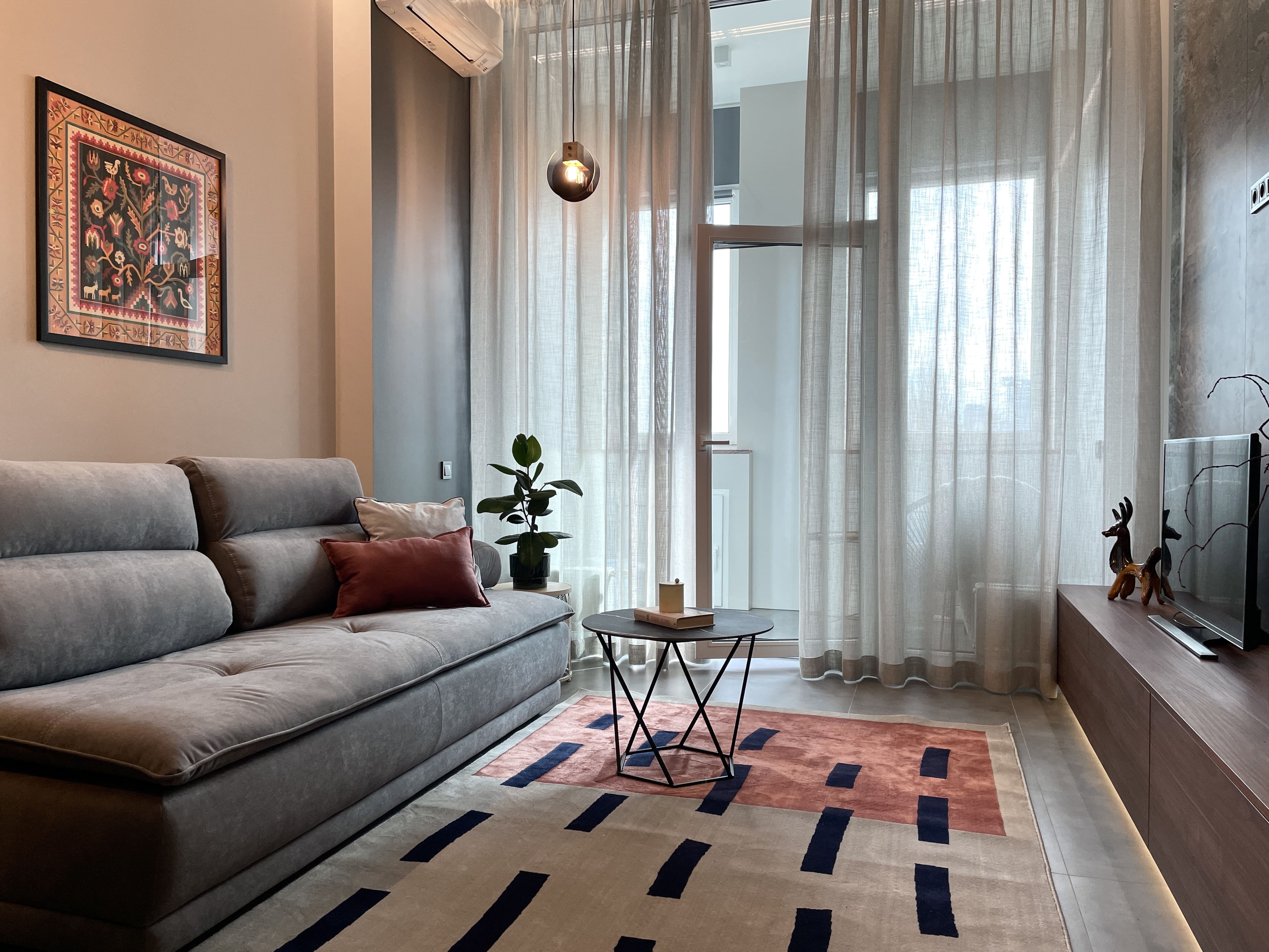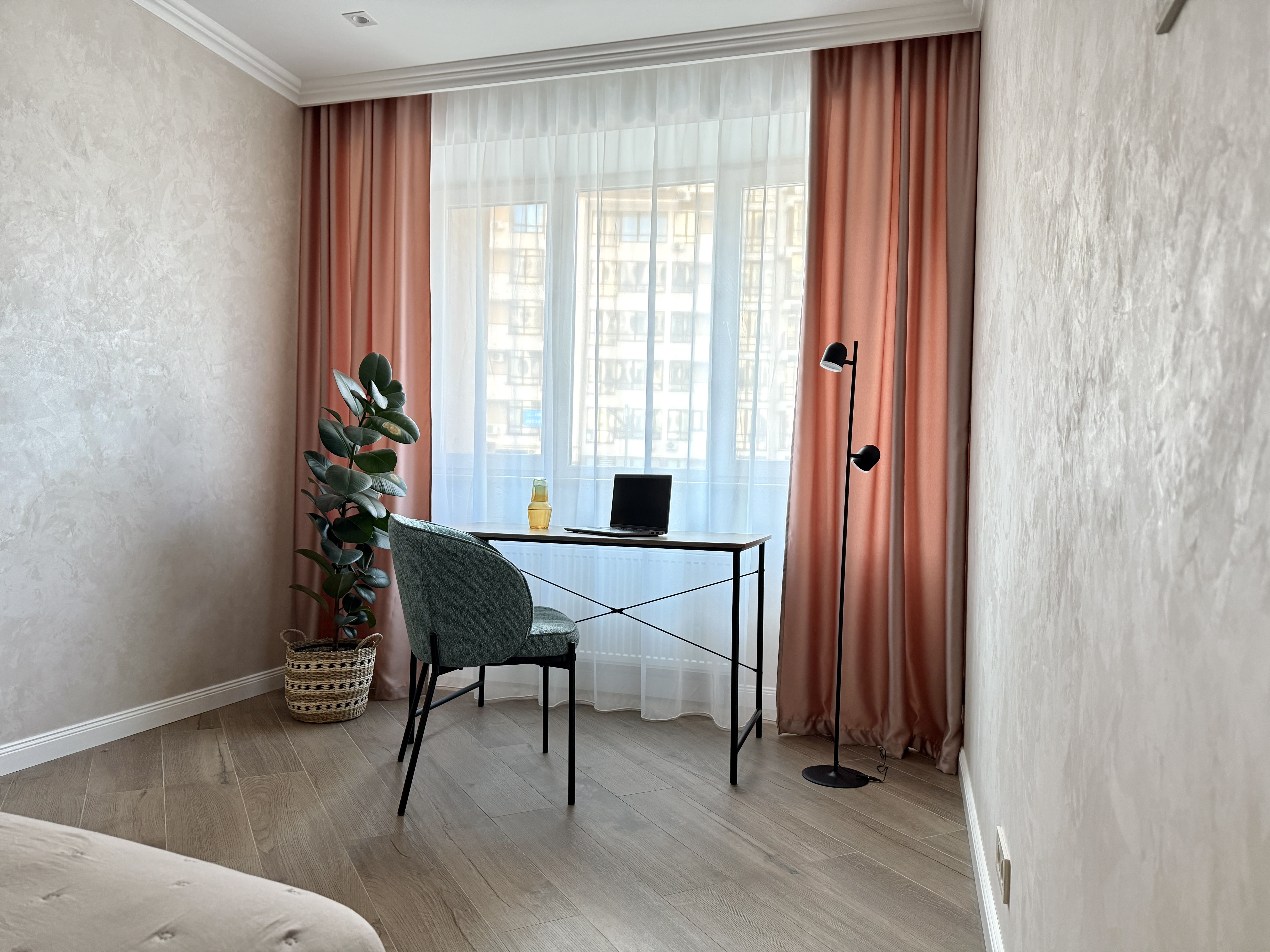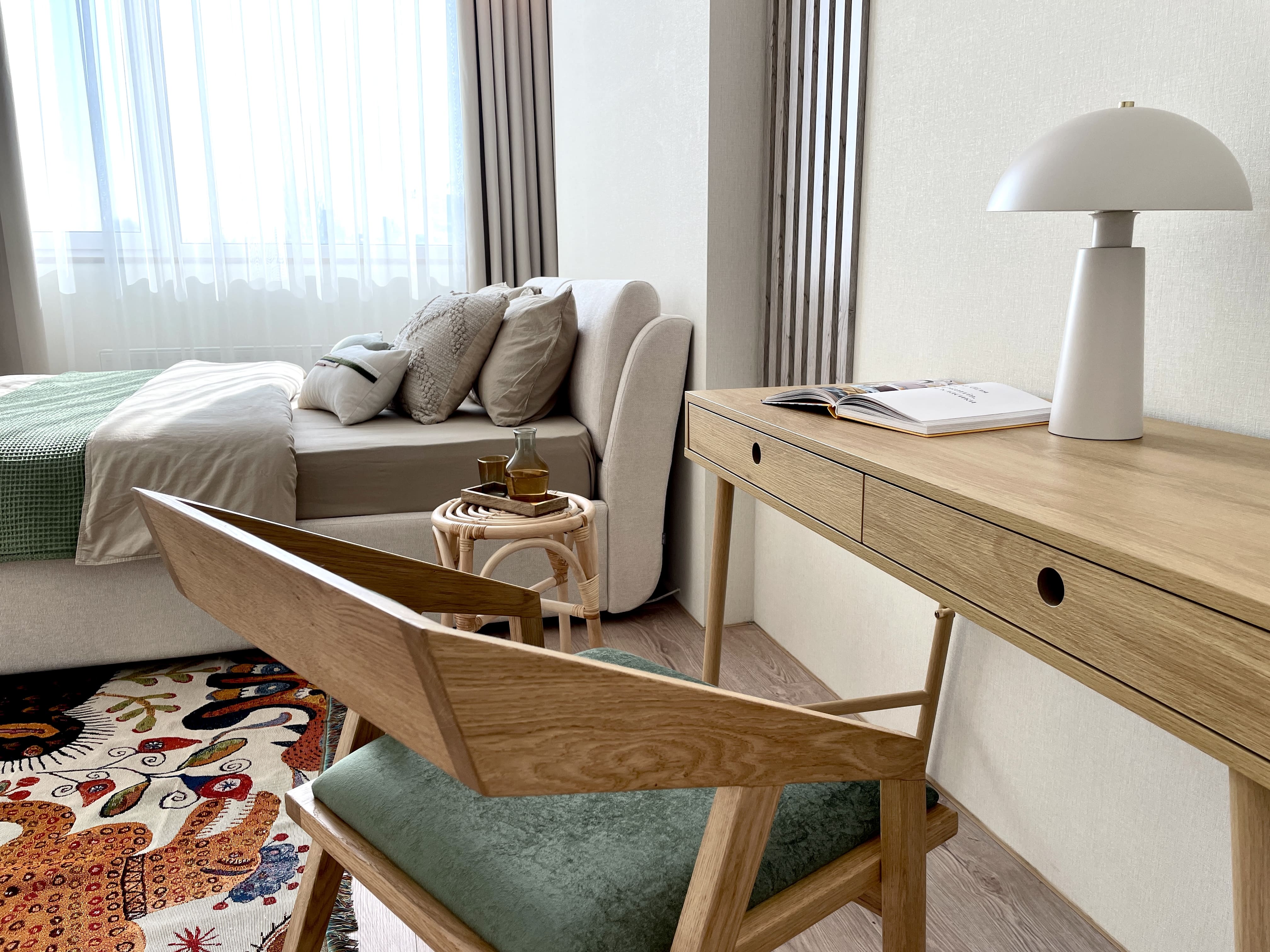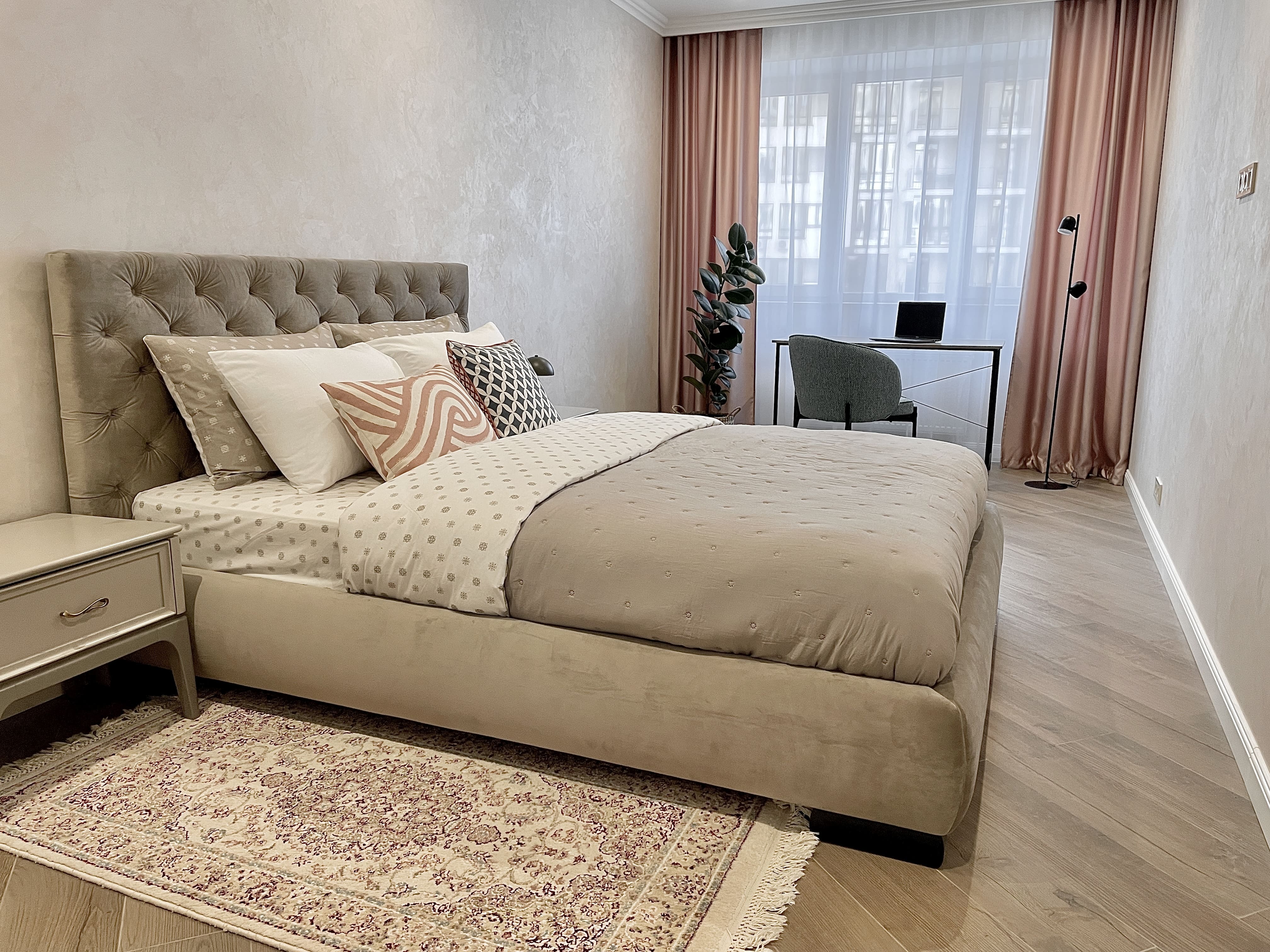 У спальні нам вдалось додатково зонувати приміщення, обладнавши робоче місце, яке, за потреби, може стати і туалетним столиком. Зона сну тепер має більш затишний та естетичний вигляд, ми додали сучасний текстиль на ліжко та замінили не актуальні приліжкові тумби. Також родзинкою спальні став арт-килим, що було створено у колаборації з фондом Марії Примаченко. Вітальня візуально перетворилась на більш теплу та комфортну, завдяки геометричному, дизайнерському килиму та додаванню декору з елементами української айдентики.