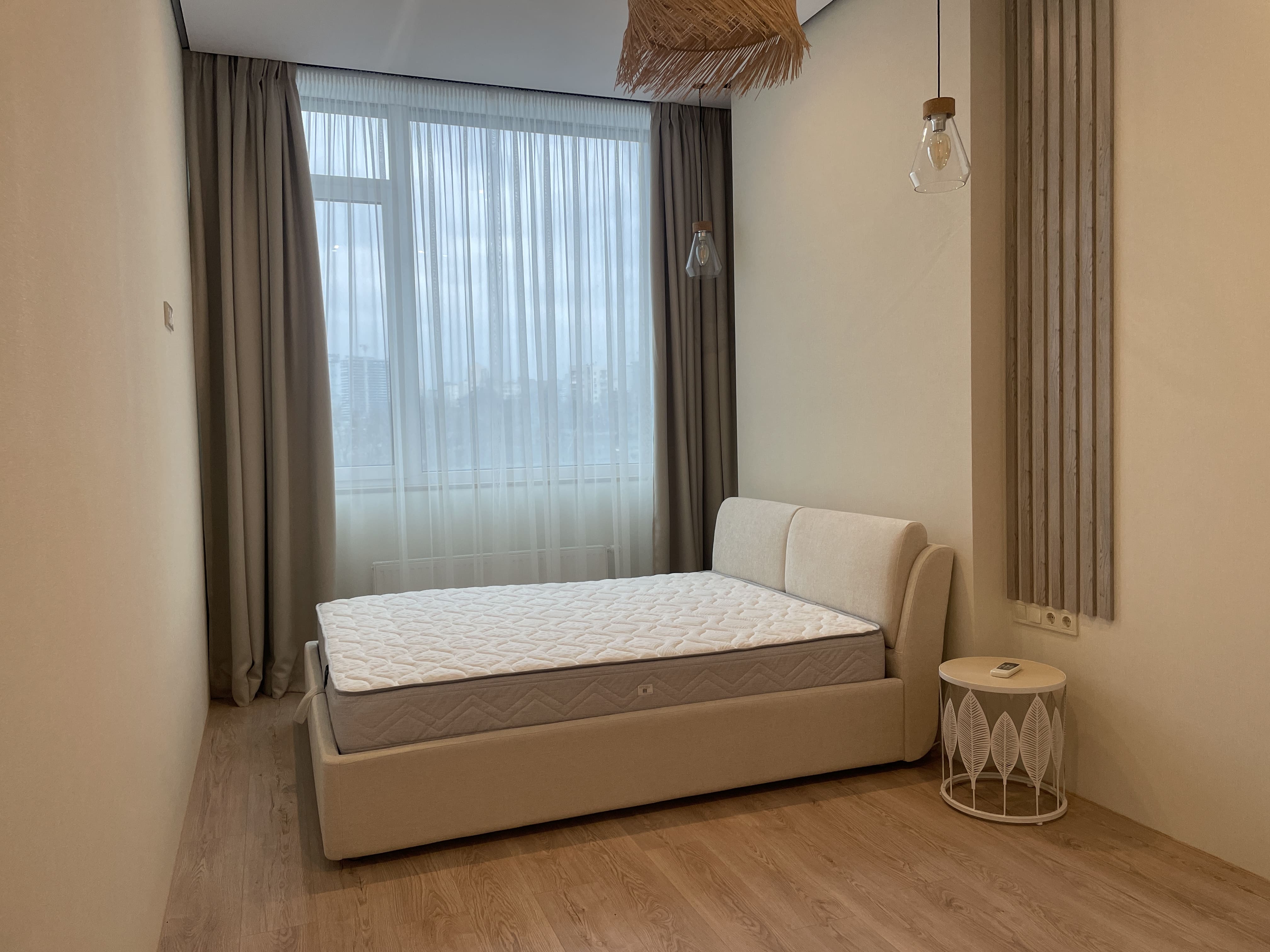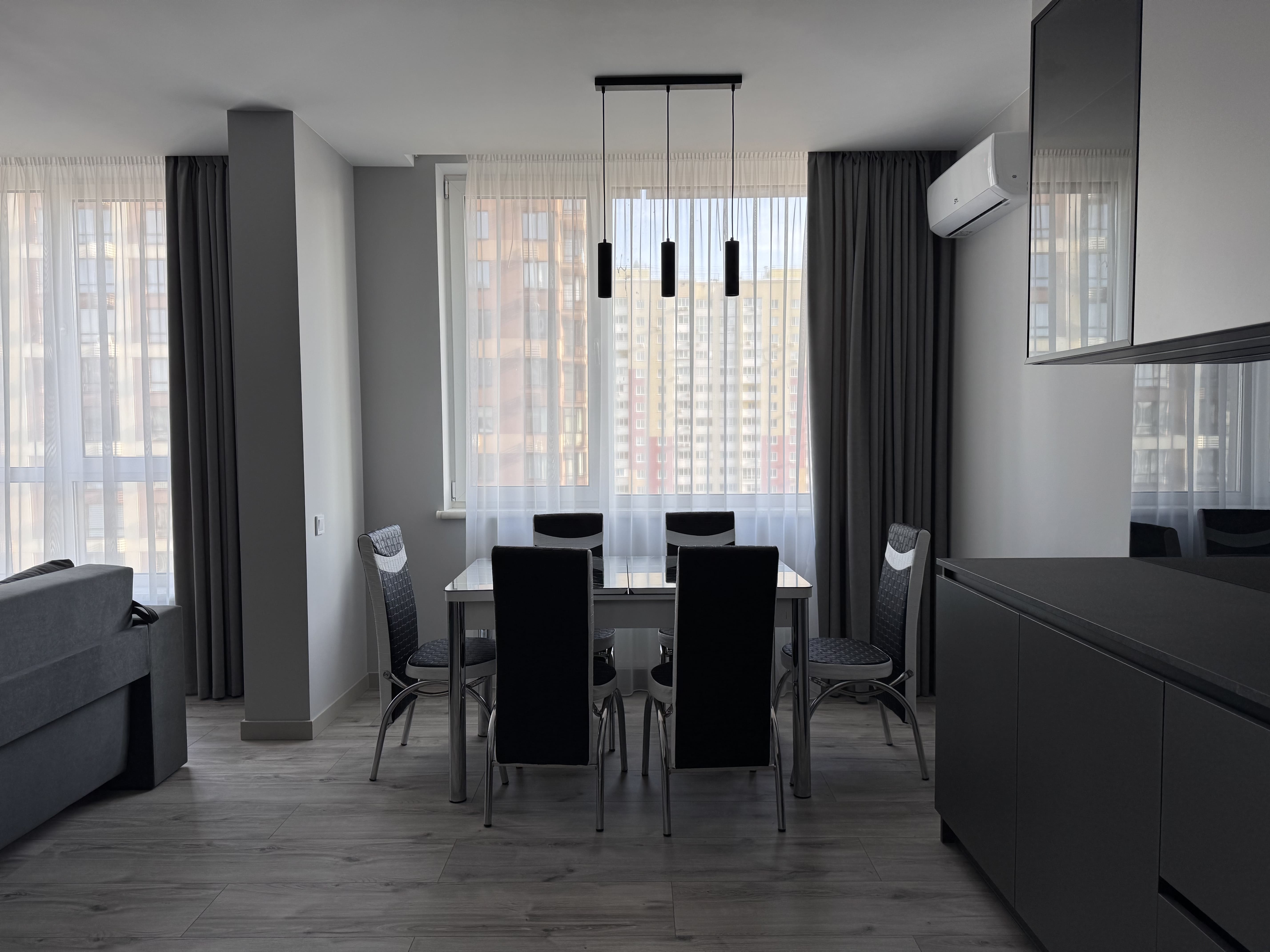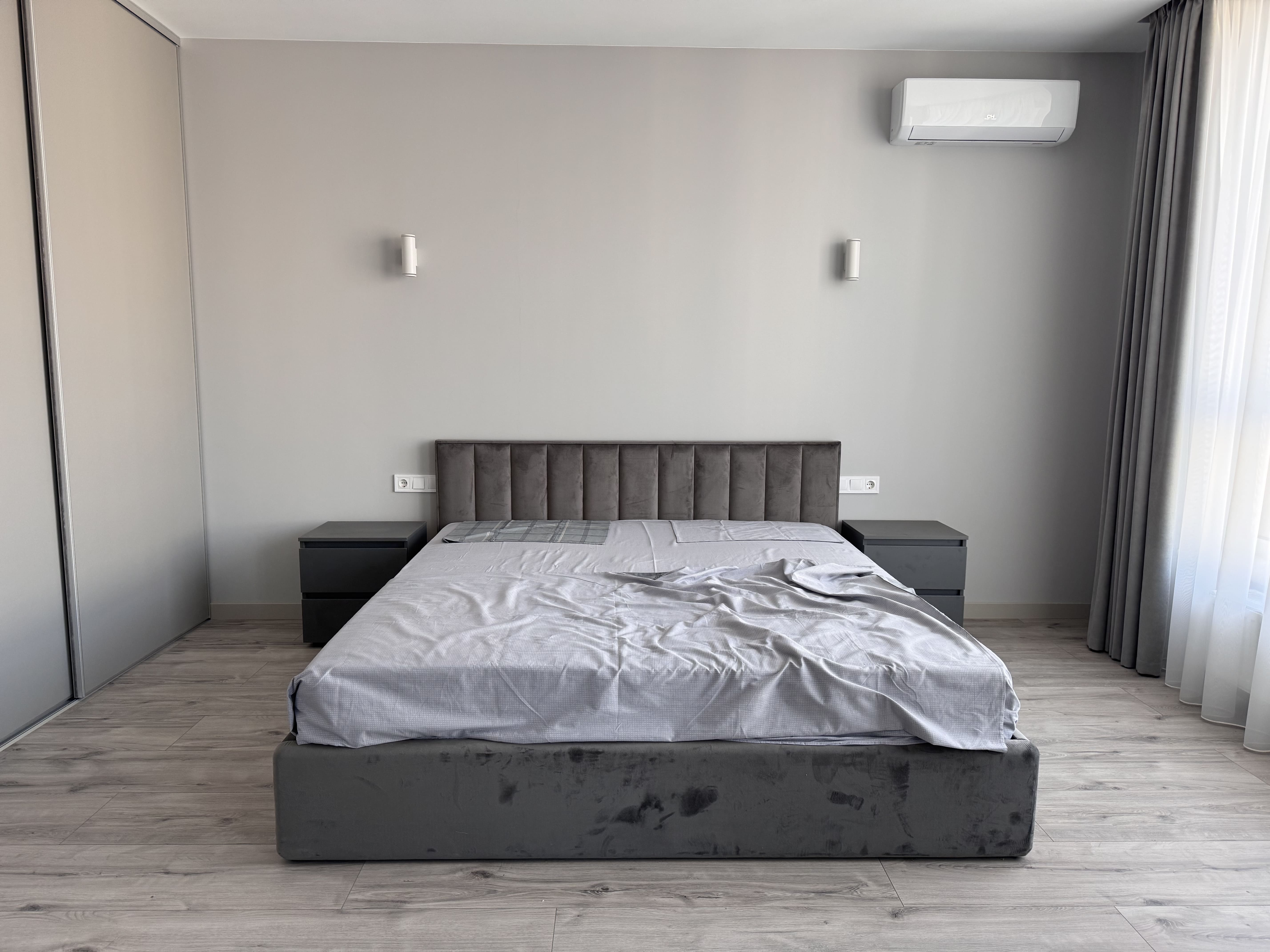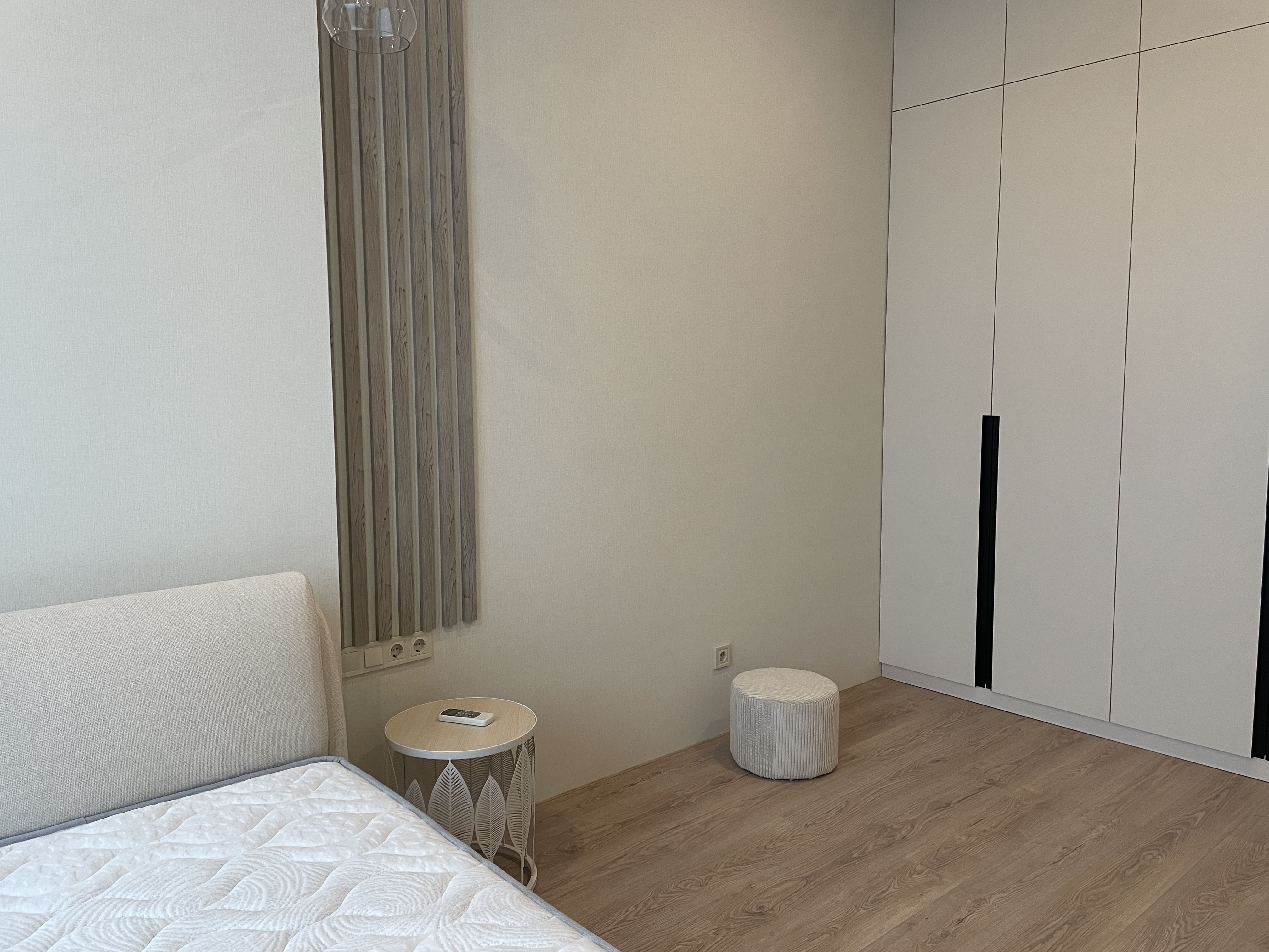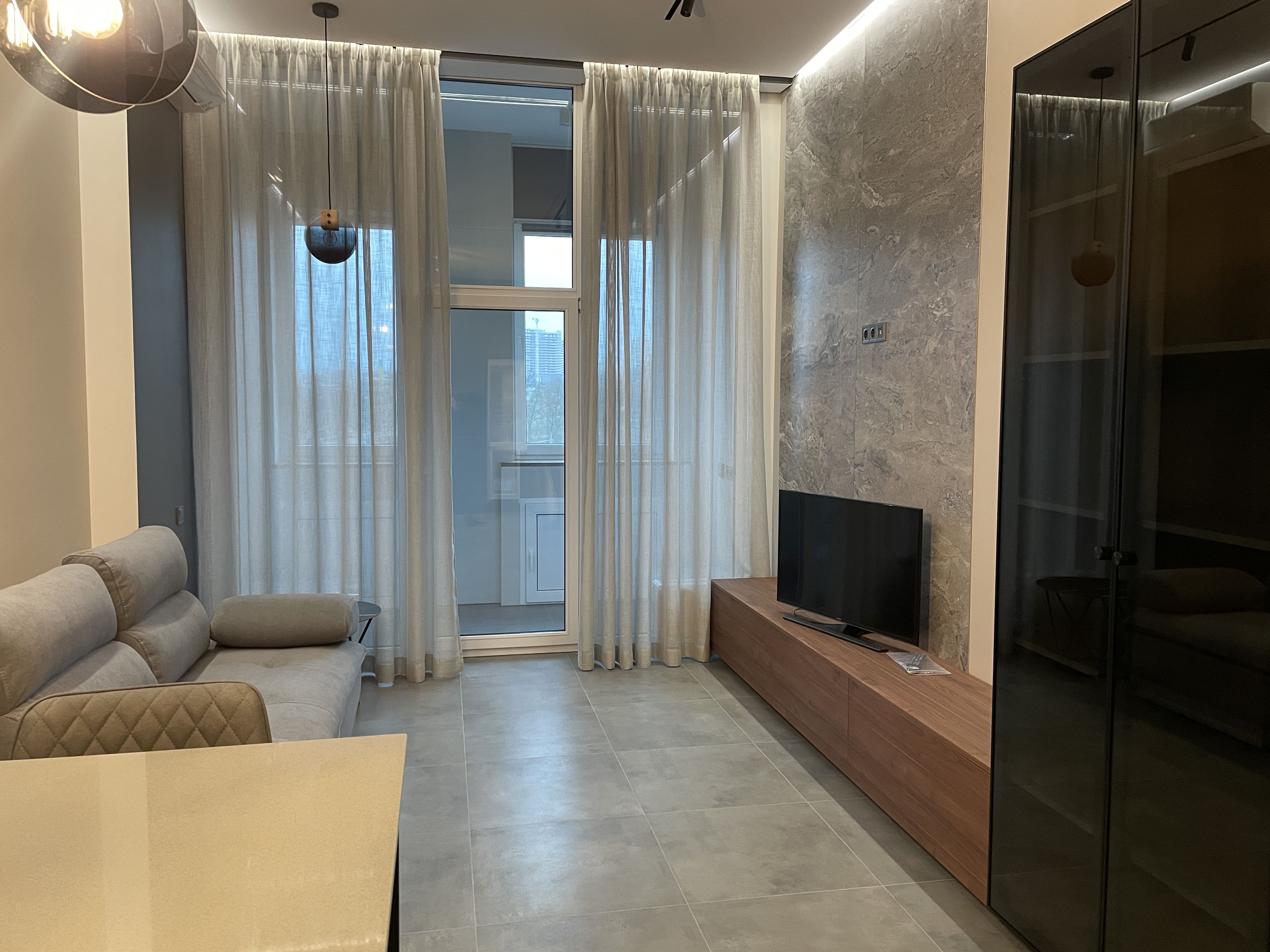 Однокімнатна квартира, у престижному ЖК Manhattan City, з окремою спальнею, що укомплектована двоспальним ліжком та вбудованою шафою. Кухня, об'єднана з вітальнею, виконана у темних кольорах, в стилістиці, що є характерною для більшості квартир даного житлового комплексу.