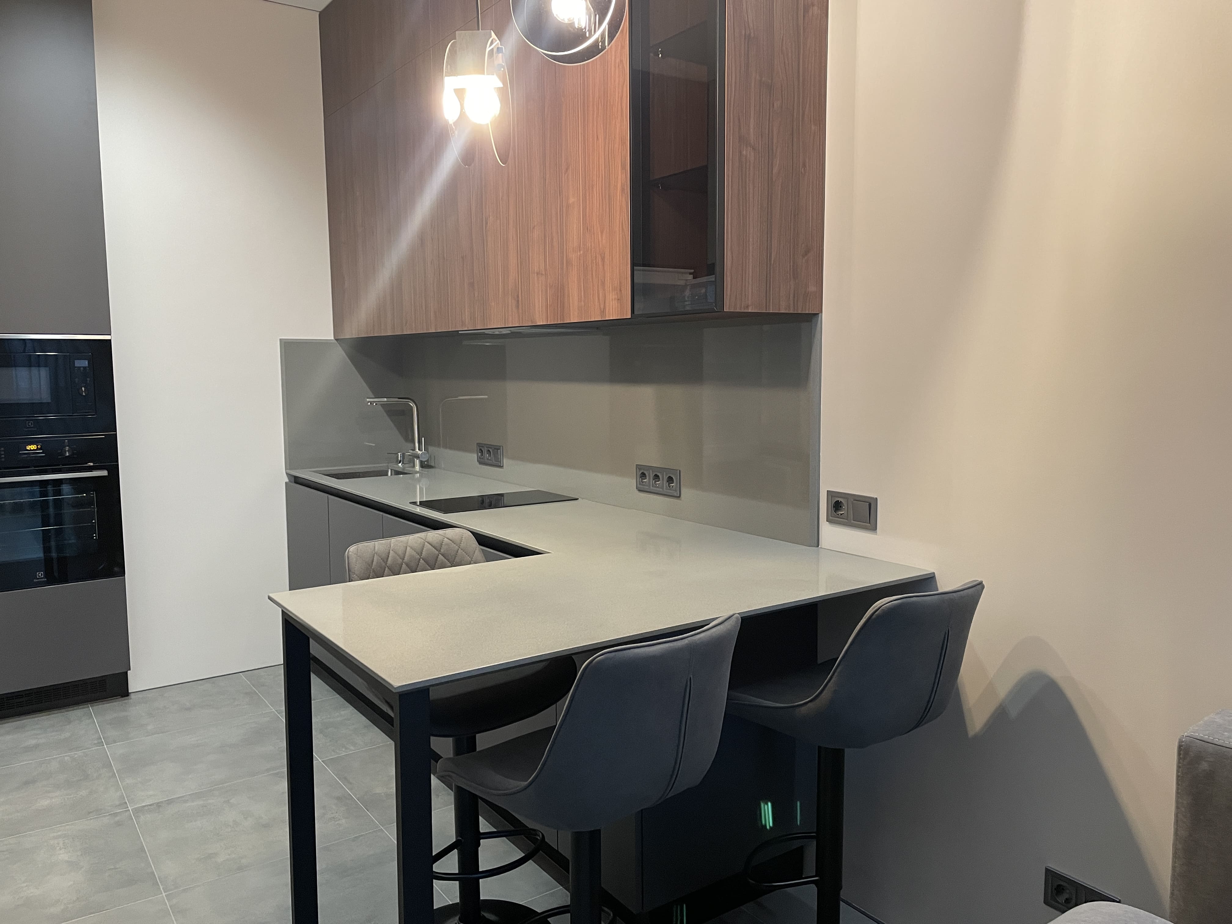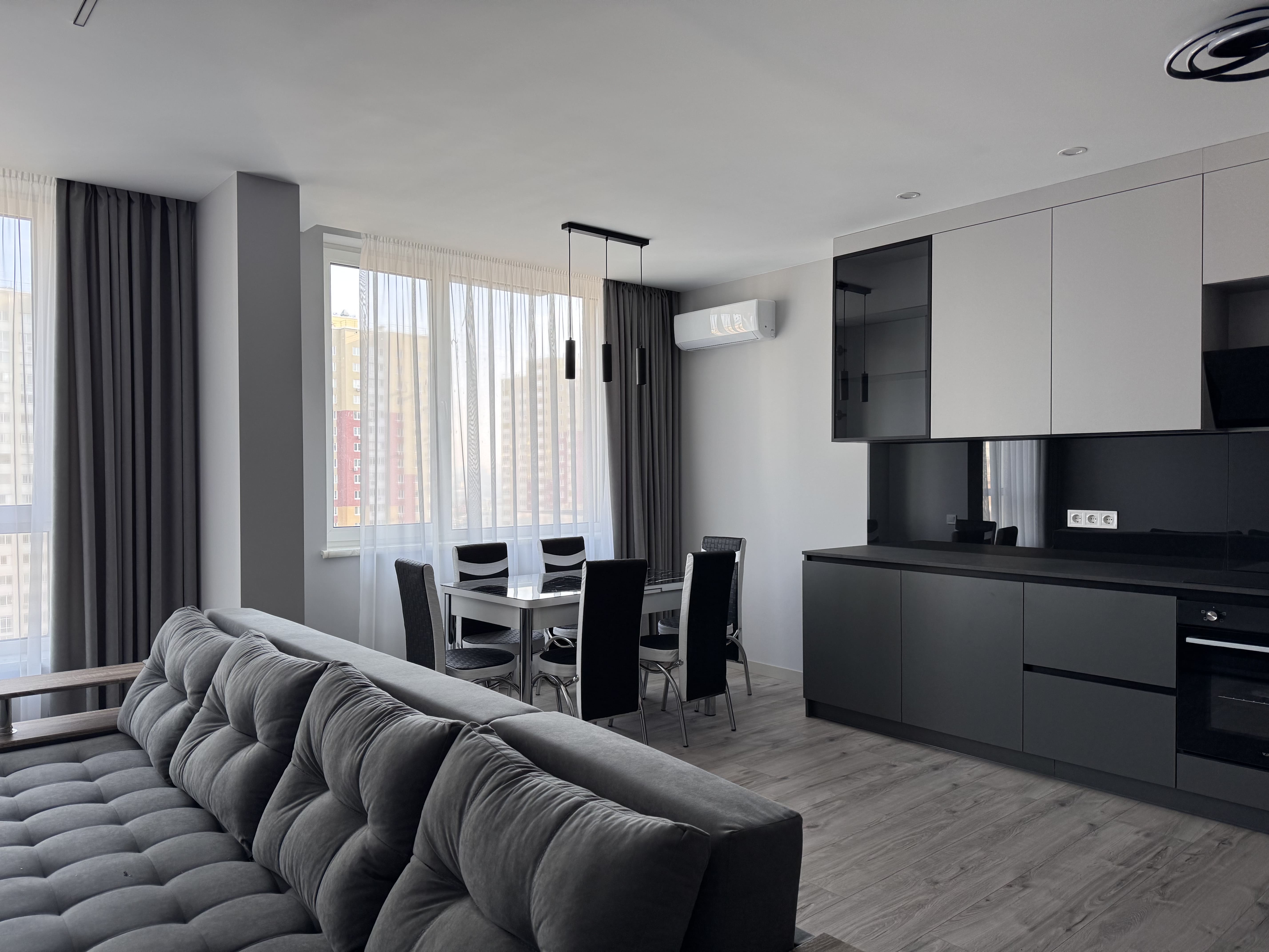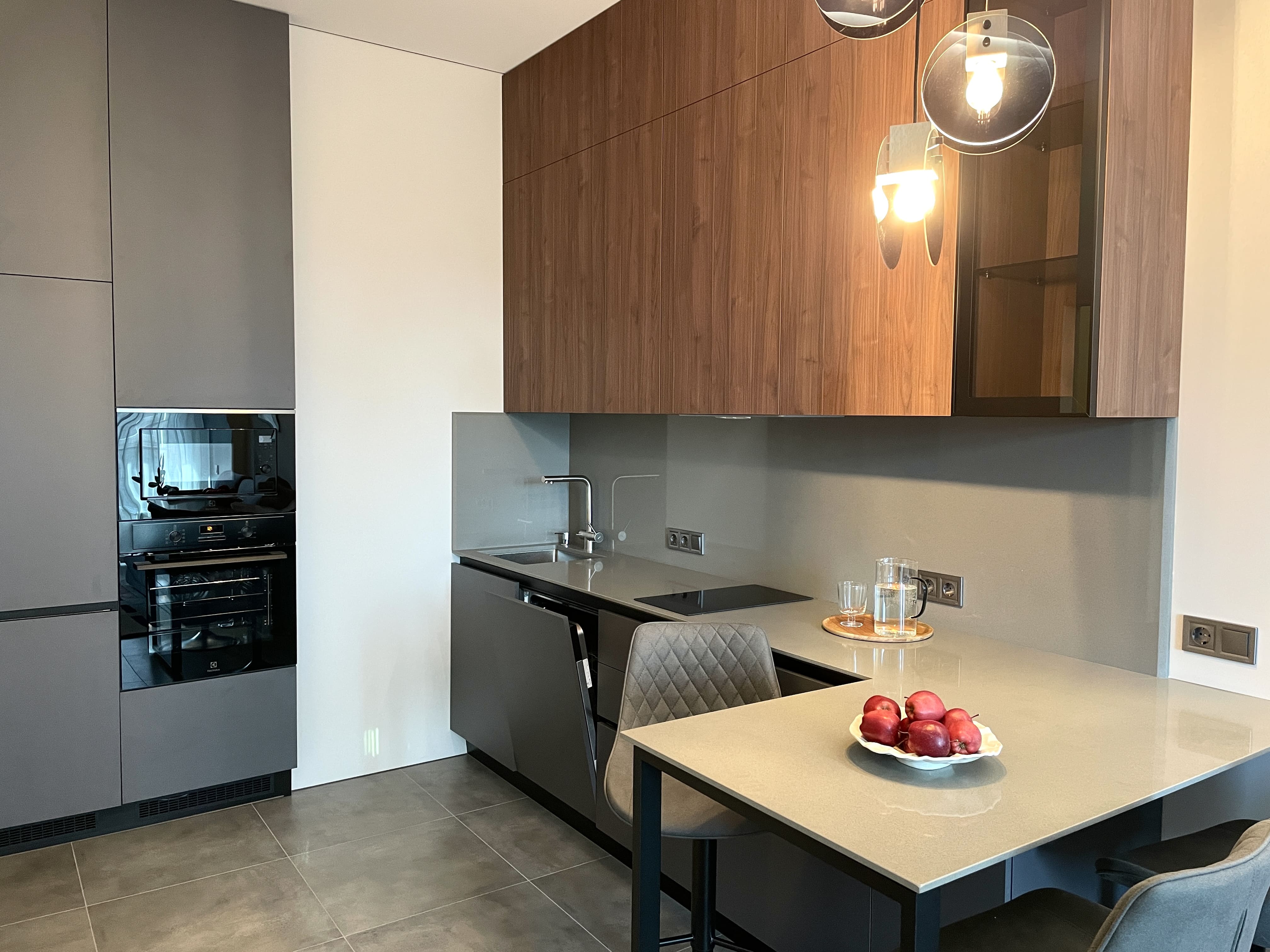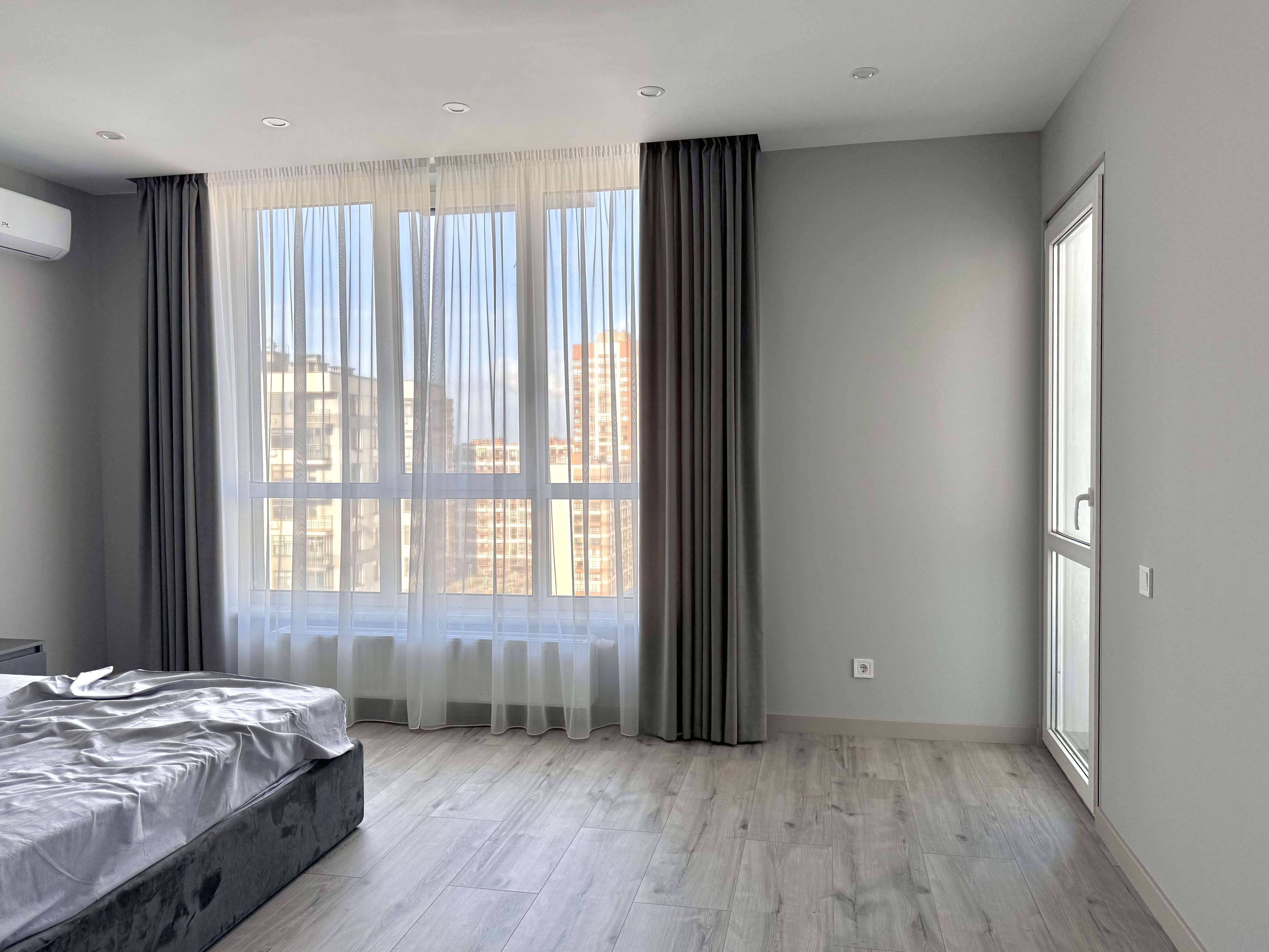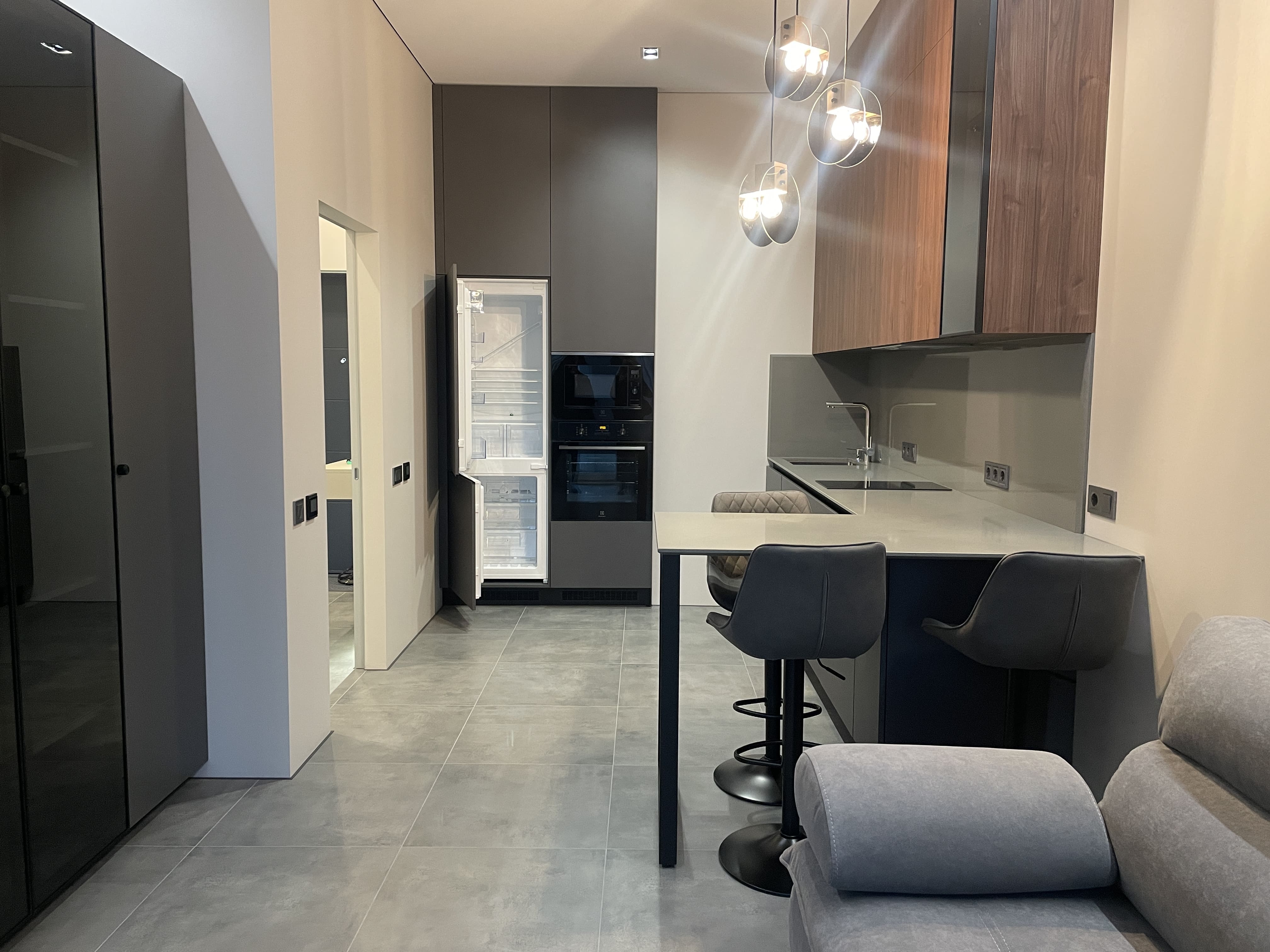 Однокімнатна квартира, у престижному ЖК Manhattan City, з окремою спальнею, що укомплектована двоспальним ліжком та вбудованою шафою. Кухня, об'єднана з вітальнею, виконана у темних кольорах, в стилістиці, що є характерною для більшості квартир даного житлового комплексу.