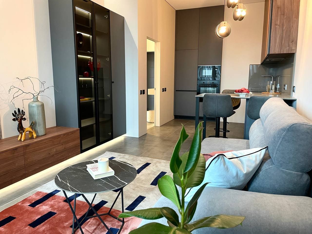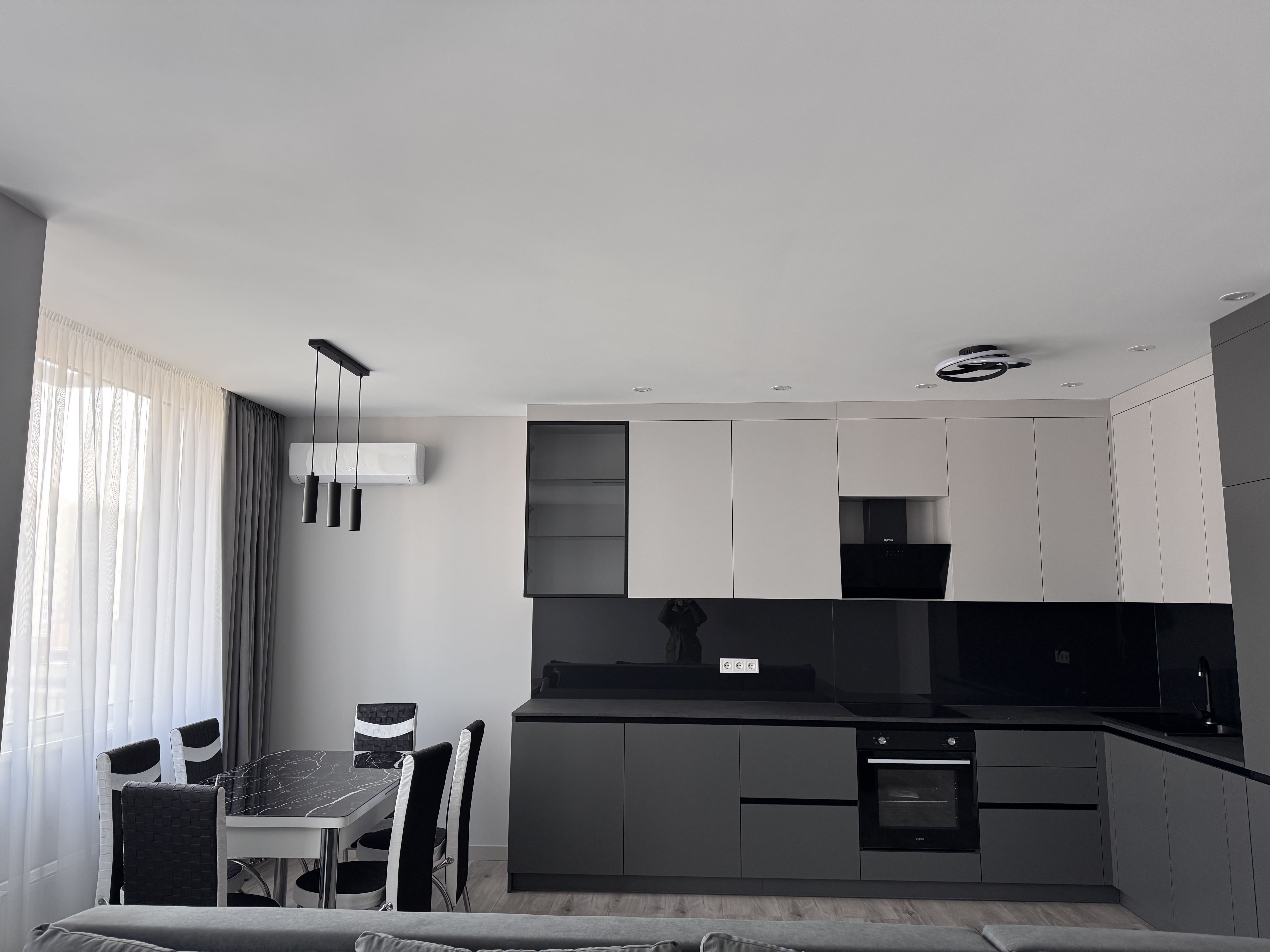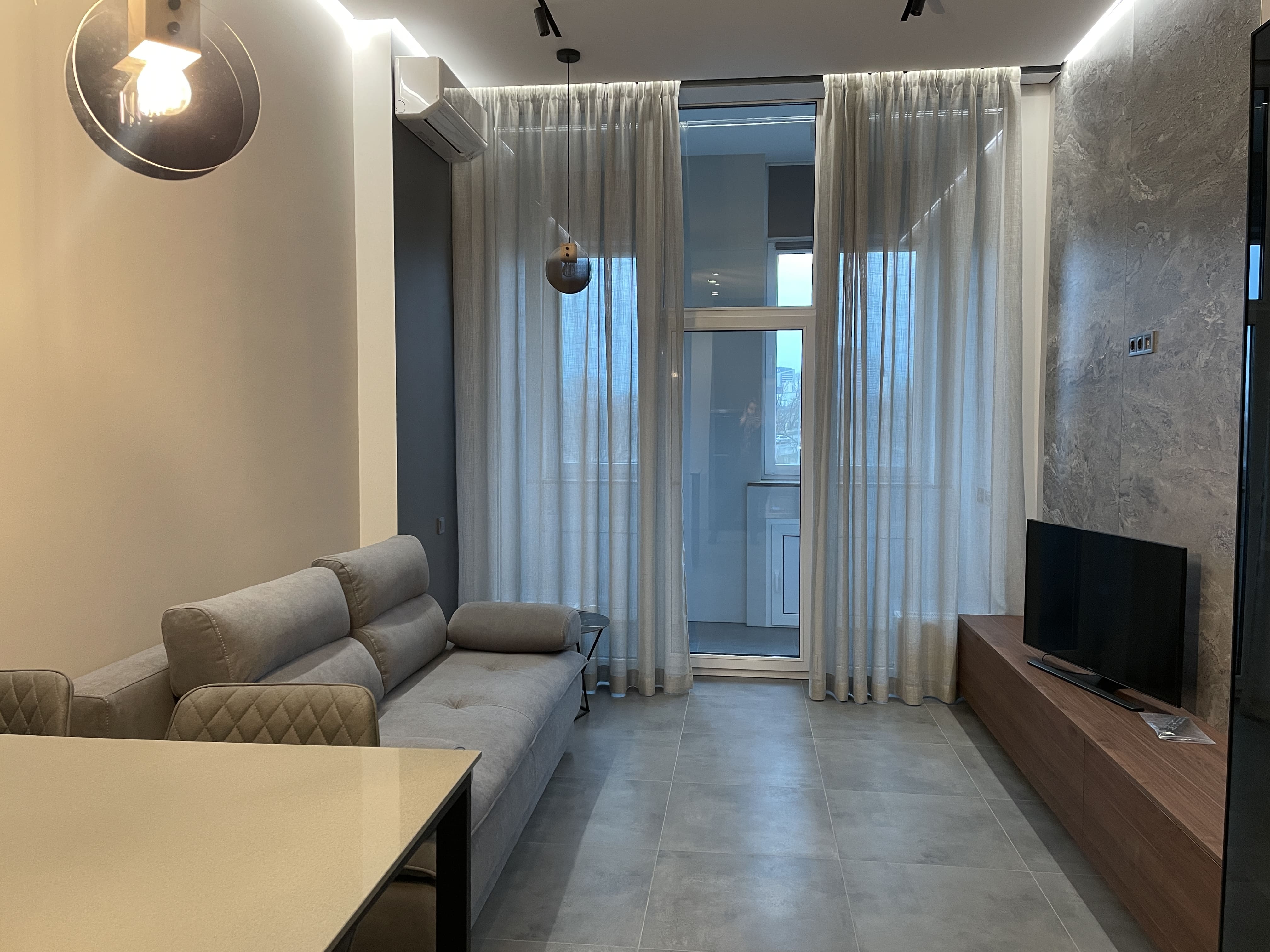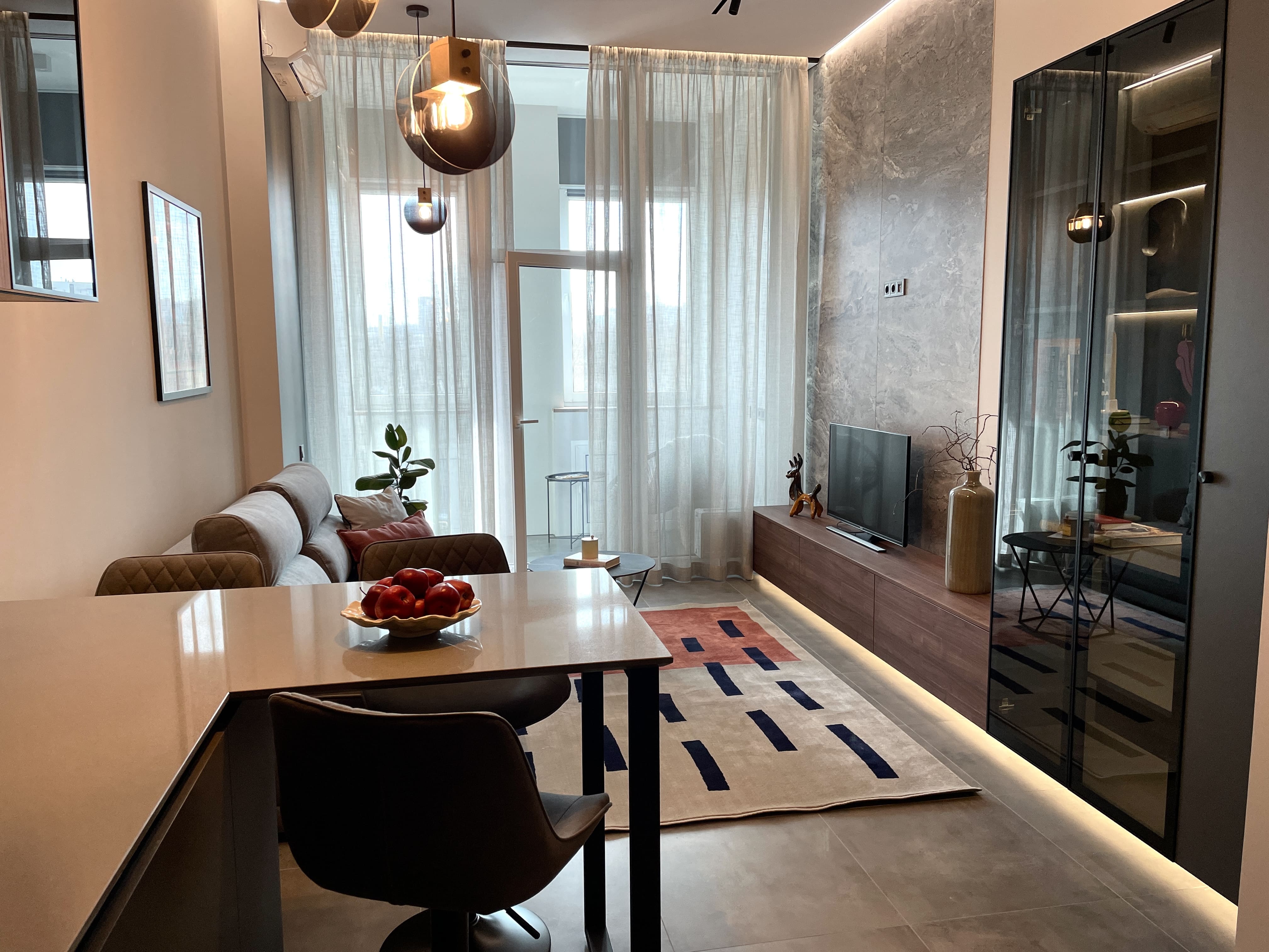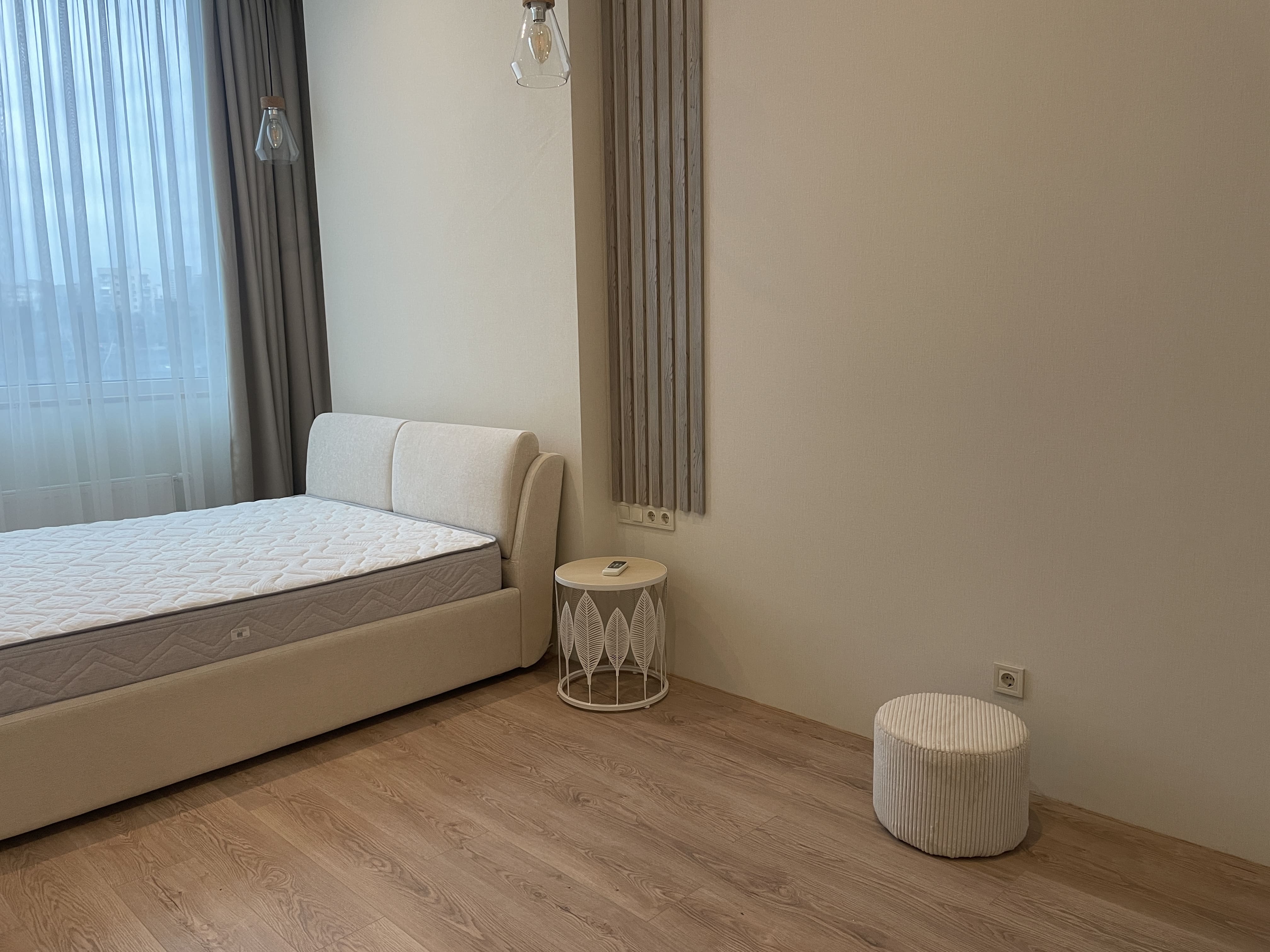 Однокімнатна квартира, у престижному ЖК Manhattan City, з окремою спальнею, що укомплектована двоспальним ліжком та вбудованою шафою. Кухня, об'єднана з вітальнею, виконана у темних кольорах, в стилістиці, що є характерною для більшості квартир даного житлового комплексу.
